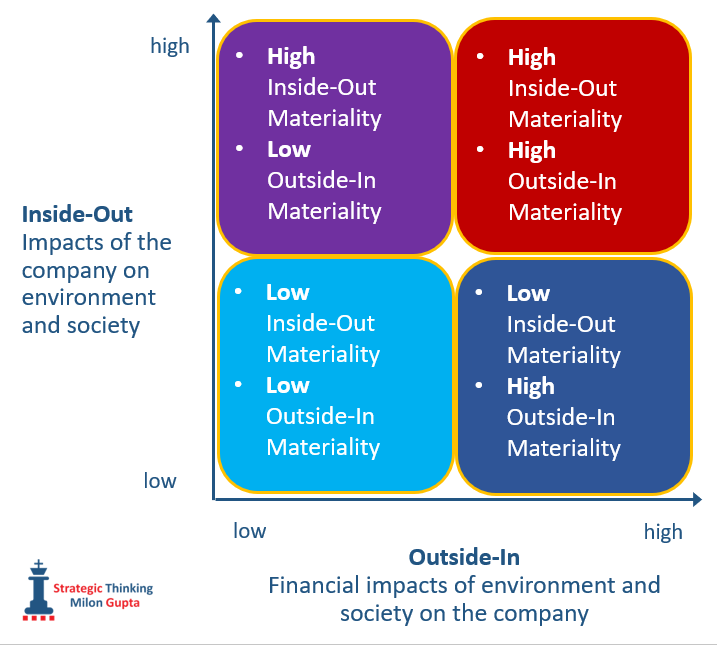 The sustainability goals should primarily address topics in the company that were rated high in the double materiality assessment both in terms of their financial impact on the company (outside-in) and in terms of the company’s impact on the environment and society (inside-out).