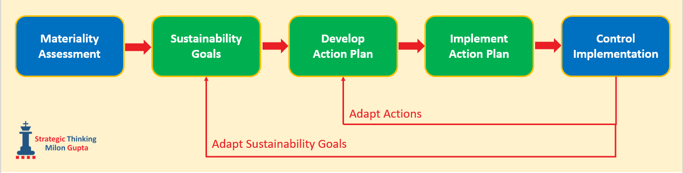 For the development and implementation of an effective sustainability strategy as part of the corporate strategy, I recommend the following five steps: