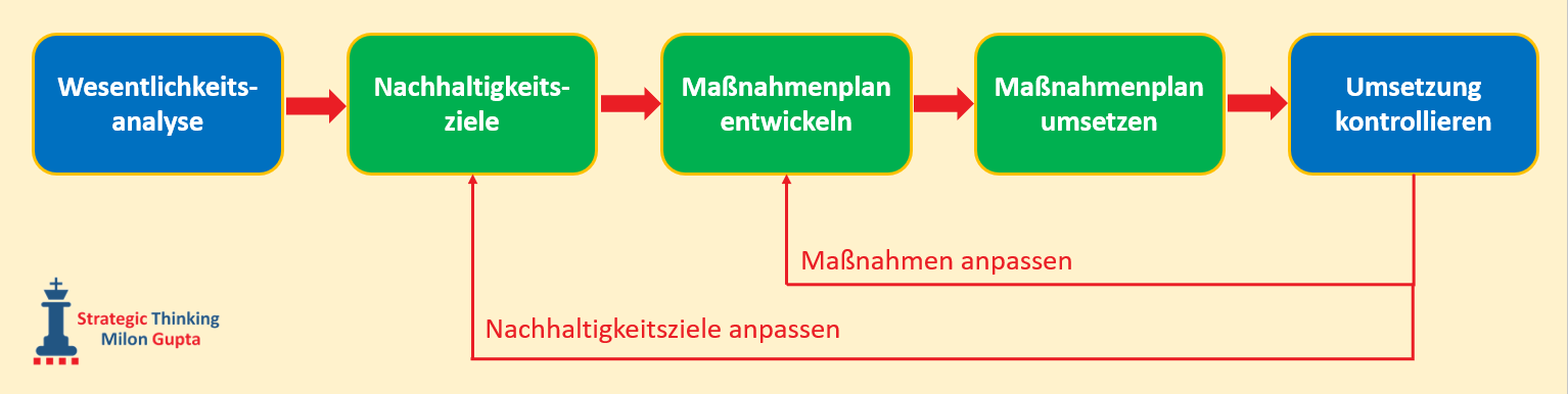Für die Entwicklung und Umsetzung einer effektiven Nachhaltigkeitsstrategie als Teil der Unternehmensstrategie empfehle ich die folgenden fünf Schritte: