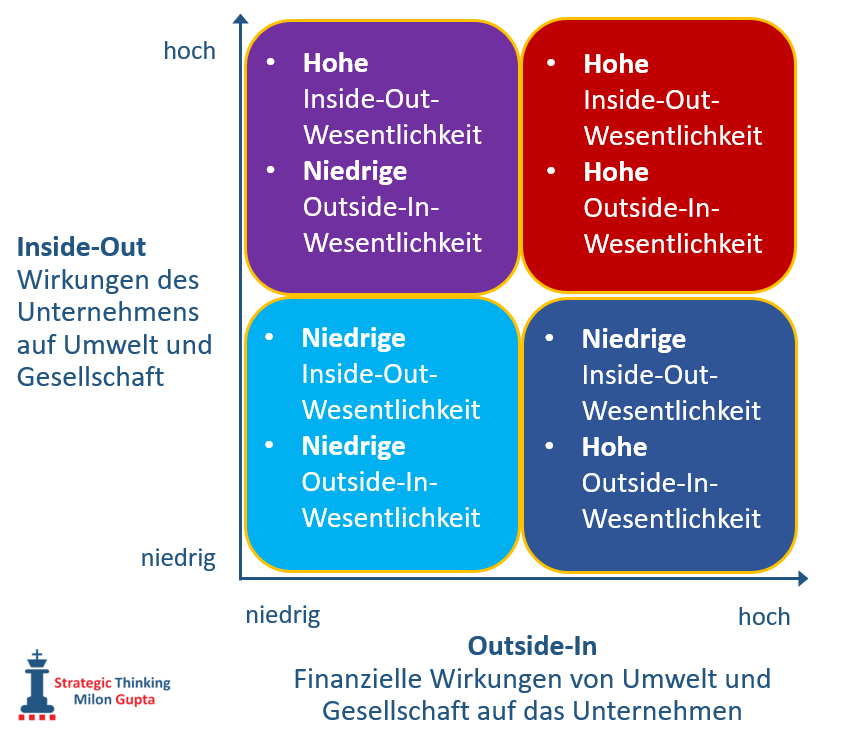 Die doppelte Wesentlichkeitsanalyse ist der Ausgangspunkt für die Erarbeitung der Nachhaltigkeitsstrategie. Dabei wird die Wesentlichkeit von Nachhaltigkeitsaspekten immer aus zwei Perspektiven zu betrachten ist: einerseits aus der Inside-Out-Perspektive (Wirkungs-Wesentlichkeit) und andererseits aus der Outside-In Perspektive (Finanz-Wesentlichkeit).